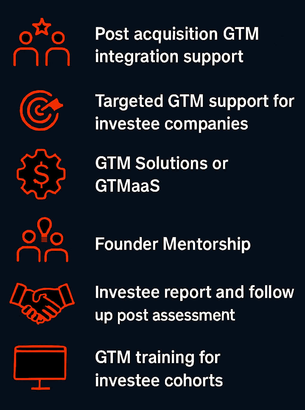 - GTM strategy and tactical training sessions for founders and senior GTM leaders in investee companies.
