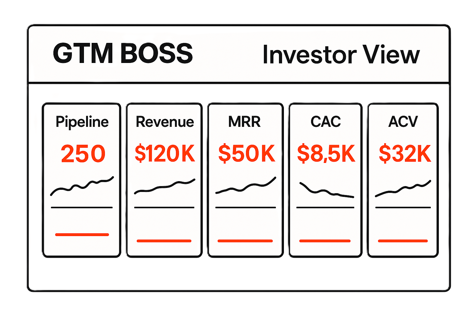 Track key sales and revenue metrics within investee companies using our customisable GTM BOSS Investor View, and track metrics and progress against the plan in real-time.