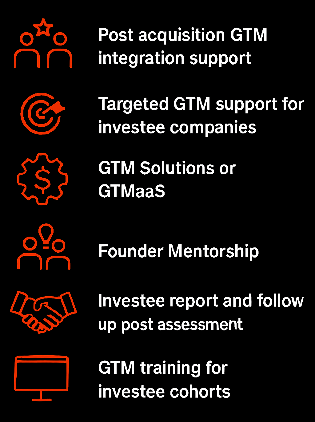 - Following an assessment or diagnostic, we can provide the investee company with a summary of our findings and work alongside you and the investee company to implement any GTM transformations.
