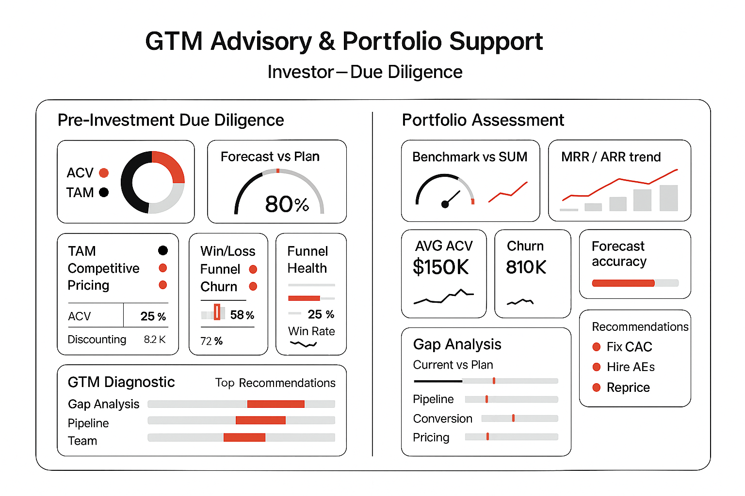 We understand that sometimes your investees need support with defining and executing their GTM strategy. We also understand that complex relationships exist between investor and investee teams and the benefits that a third party team can bring to the mix. We’re happy to help with pre-investment due diligence by providing an independent view of an investee’s GTM opportunity and the their current ability to execute it.